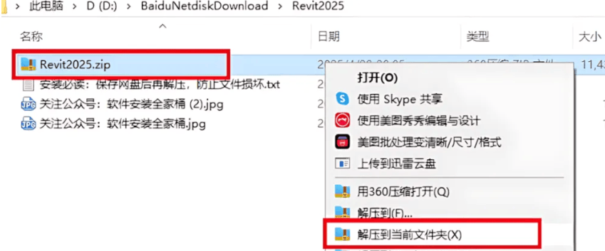 打开下载的Revit软件安装包,鼠标右击压缩包选择【解压】。