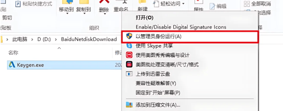鼠标右击【Keygen】注册机,然后选择【以管理员身份运行】。